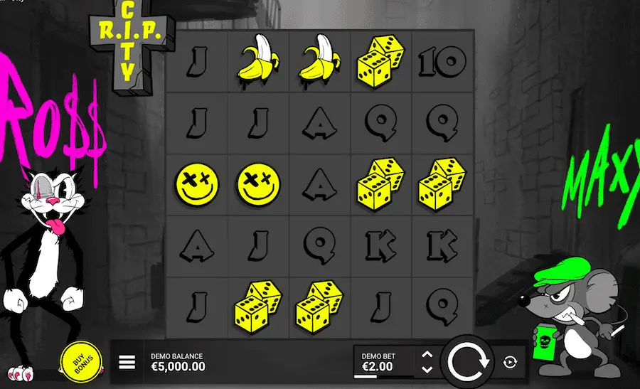 L’action du jeu se déroule dans une ville monochrome de dessin animé avec deux bad boys en personnages centraux, RO$$ le chat et MAXX la souris. Les personnages changent de position au cours du jeu et réagissent aux gains et aux bonus, un détail que j’ai beaucoup apprécié, car il renforce clairement le côté immersif.